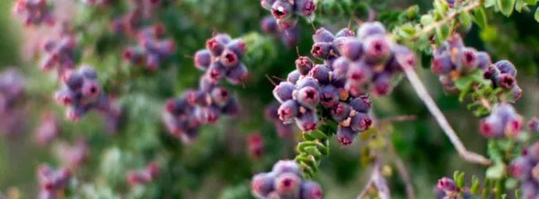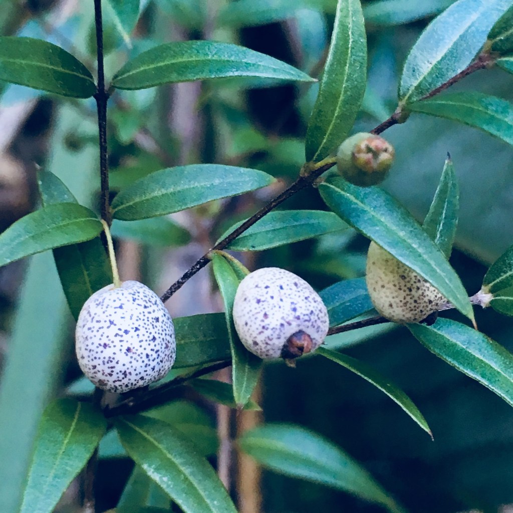 | Size of Plant: Small shrub Edible Part: Berries Suggested use in cooking: Look like blueberries. Nutmeg-ish flavour. Snacks, desserts, jams. Fun Fact: Its berries are speckled like mini purple marbles — very snackable! Traditional Use: traditionally used by Indigenous Australians as a food source and for medicine. The sweet berries were a valued bush tucker, and the leaves and berries were used topically for wounds or as a tonic to aid immunity. It was also used to treat coughs and colds. |